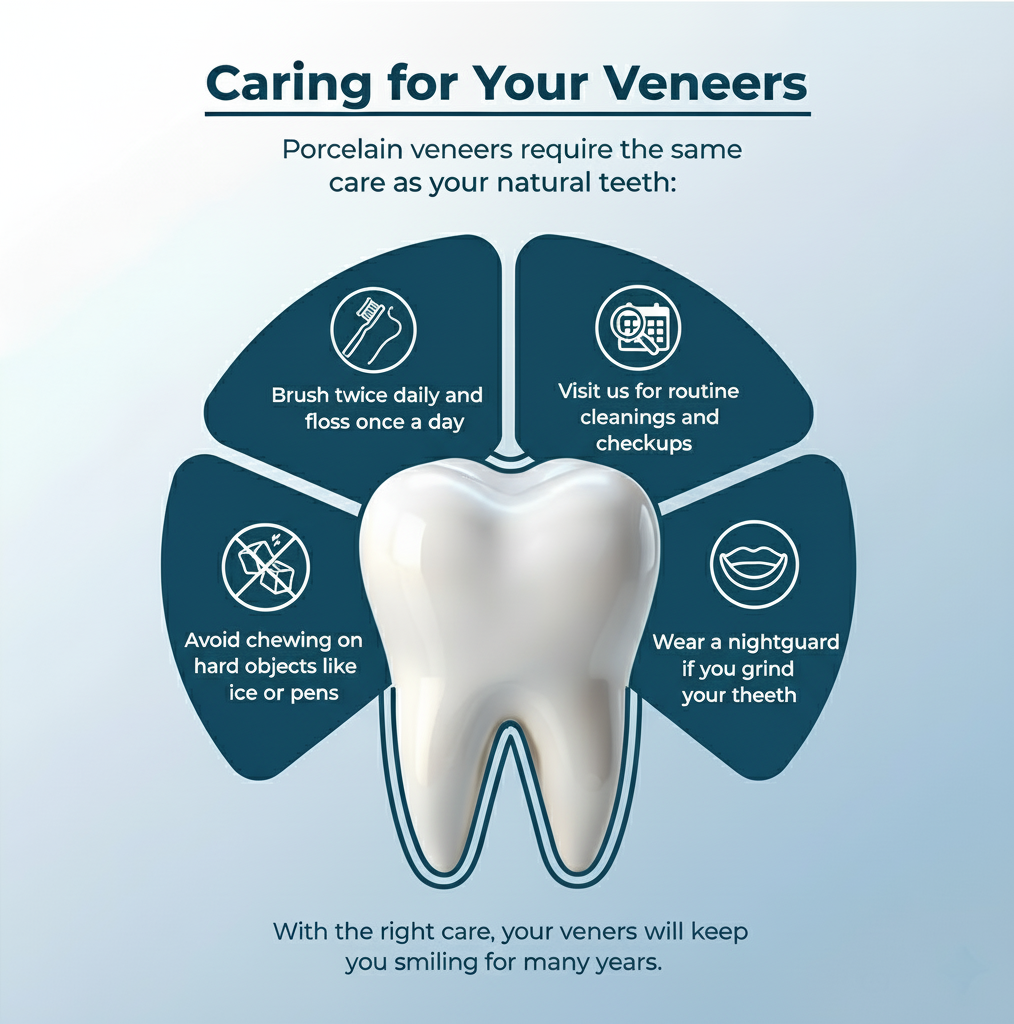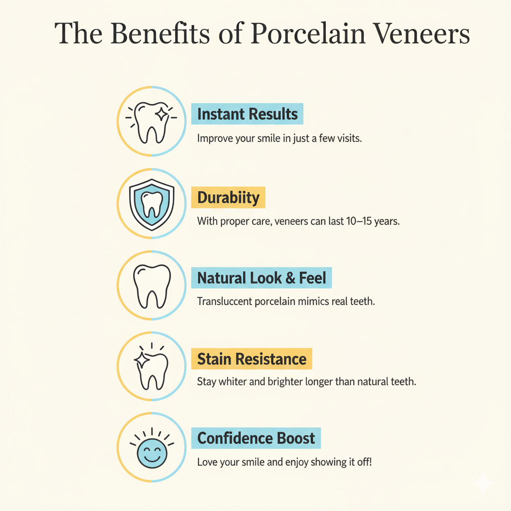 Porcelain veneers are thin, custom-made shells designed to cover the front surface of your teeth. Made from high-quality porcelain, veneers look and feel like natural teeth while correcting a wide range of cosmetic concerns. Because porcelain reflects light much like real enamel, the results are seamless and long-lasting.Dental veneers are one of the most versatile cosmetic treatments. They can correct:
